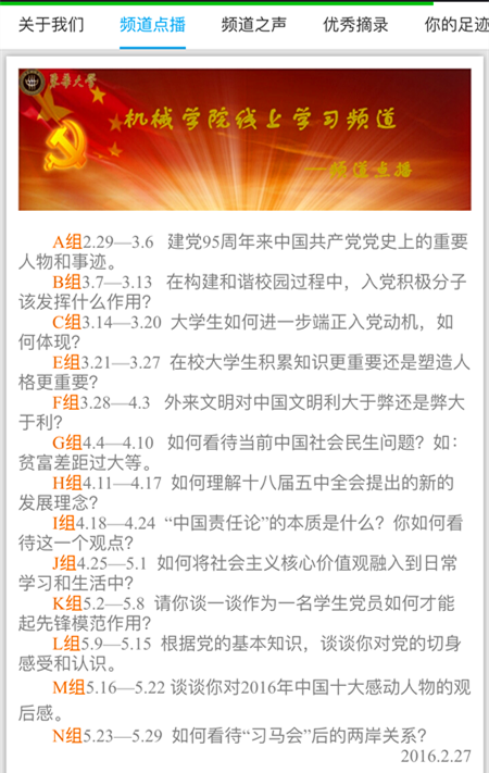 为了给广大学员提供一个发表个人观点的平台,使其在争论与探讨中深入理解党的政策与方针,提高党性修养,机械学院易班发展中心联合机械学院党校在易班上开通了名为“机械星期八”的线上学习频道每期1个精选议题,为期一周,共12个议题,不间断推送。该线上频道自开通以来便引发学院老师、学生党员、入党积极分子和发展对象的热切关注,大家纷纷在易班上发表自己对议题的看法与见解