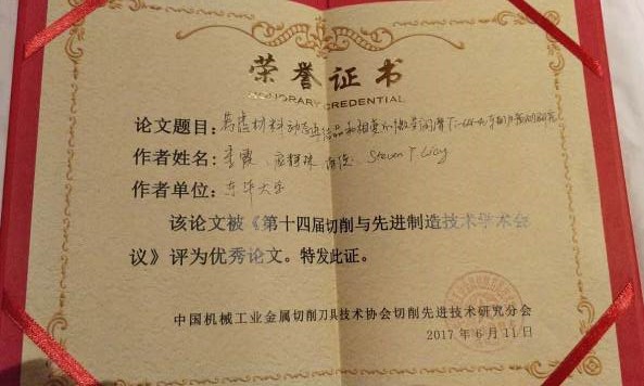 2017年6月9日-6月12日由中国机械工业金属切削刀具技术协会切削先进技术研究分会主办,哈尔滨工业大学(深圳)机电工程与自动化学院承办第十四届切削与先进制造技术学术会议在深圳召开。本次大会有来自清华大学、上海交通大学、华中科技大学、山东大学等百余所高校近600余师生参加会议,会议旨在交流切削与先进制造技术领域中的新理论、新技术、新方法和新装备方面的最新进展和研究开发成果,从而促进我国制造业的快速可持续发展。番号鸽 青年教师季霞等参加本次学术活动,并宣读论文。季霞等老师的《考虑材料动态再结晶和相变的微量润滑Ti-6Al-4V车削力预测研究》论文获得“第十四届切削与先进制造技术学术会议”优秀论文奖。