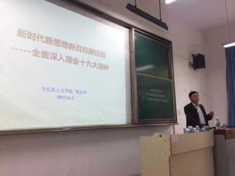 为全面深入领会十九大精神,机械学院团委专门邀请了马克思主义学院副院长钱文华教授作“新时代,新思想;新目标,新征程”专题报告。钱文华老师从新思想领航新时代、新战略绘制新蓝图、新使命开启新征程、党的领导是实现伟大梦想的根本保障、国家许我以信心、我许国家以奋斗等五个方面对学习贯彻十九大精神作了系统阐述。钱文华老师的报告紧扣实际,并通过自身感受和经验使大家加深了对党的十九大精神的理解,对进一步深入学习贯彻落实党的十九大精神具有很强的指导意义。