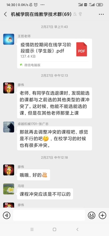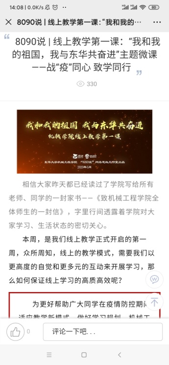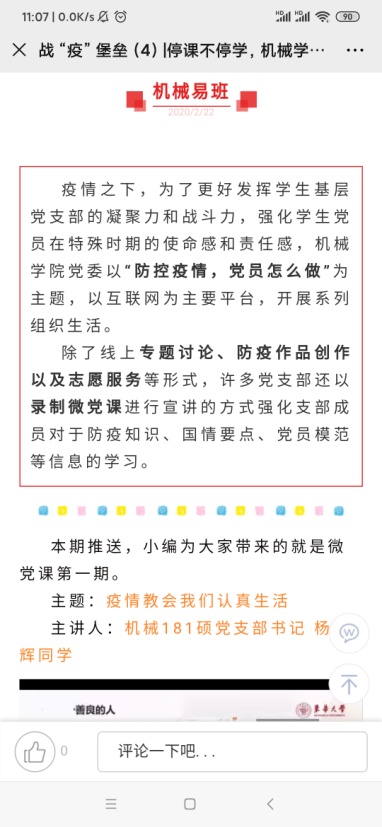 党员教师积极组建在线教学技术支持团队,全天候随时应对师生在线学习中遇到的各类突发问题,为在线教育保驾护航;2019级本科生班导师张慧乐老师录制“战‘疫’同心,致学同行”思政微课,针对超星学习平台的使用方法、学校协同平台的功能及使用、在线教学常见问题进行了详细讲解,坚决守护“学习防疫线”。