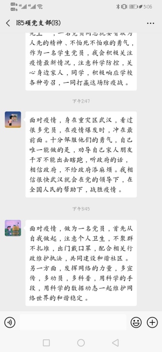 为深入学习领会习近平总书记关于新冠肺炎疫情的系列重要讲话精神,鼓励学生党员发挥先锋模范作用,守使命、担使命,当好“红色堡垒”主心骨。组织学生党支部在2月和3月分别开展“防控疫情,党员怎么做”、“致敬新时代雷锋”网络主题党日活动,号召学生党员统一思想认识,提高政治站位,以实际行动坚决打赢这场疫情防控阻击战。
