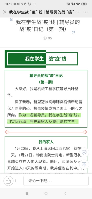 紧密围绕疫情防控这一重点,广泛开展爱国主义教育、理想信念教育,引导广大学生以爱国情心系祖国、以强国志奉献祖国、以报国行报效祖国。以易班网络思政平台为主阵地,开设“我在学生战‘疫’线”、“战‘疫’堡垒”、“青春战‘疫’易起来”等专栏,通过辅导员的抗“疫”日记、空中系列主题班会、战“疫”组织生活、微党课巡展、抗“疫”文艺作品等形式,讲好疫情防控中的中国故事,利用这一场没有硝烟的“全员战争”,借助社会这个“大课堂”、人民群众这位“好老师”,上好一堂生动而难忘的爱国主义“思政大课”,强信心、筑同心,吹响“红色堡垒”集结号。