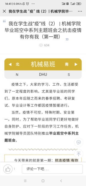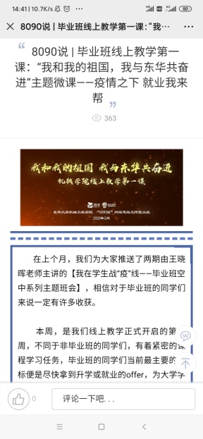 毕业班辅导员王晓晖老师积极利用易班平台发布“疫情之下,毕业班同学在行动”、“疫情之下,如何进行考验复试”、“疫情之下,就业我来帮”、“疫情当前,线上招聘面试需要注意哪些问题”等系列线上主题班会,坚守就业工作一线,确保就业工作不掉线、就业服务不打烊,坚决打赢就业攻坚战。