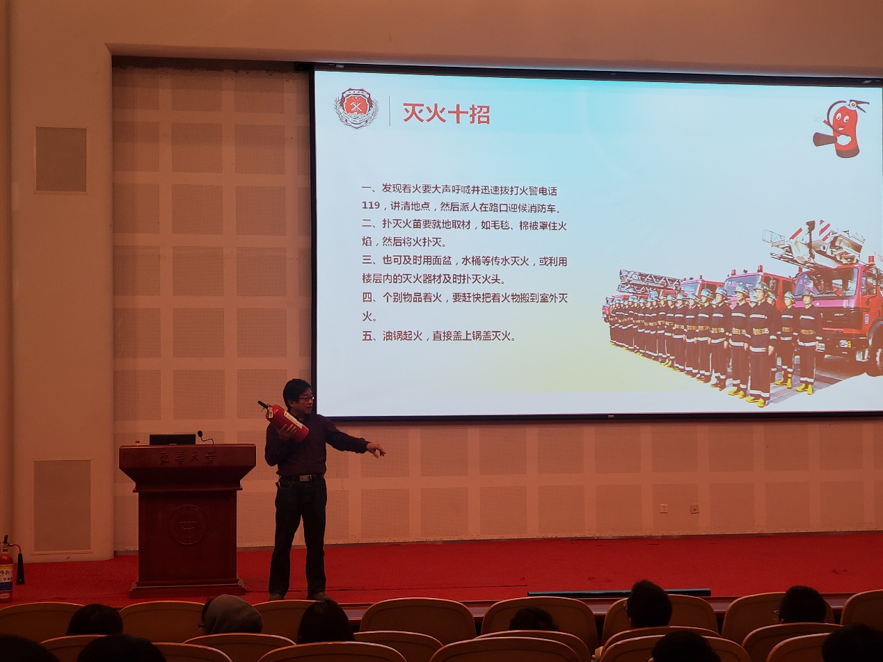 顾一平从校园防火、防盗、防网络诈骗、交通安全等方面进行授课,通过幽默风趣的语言和具体案例的剖析为大家普及了方方面面的安全知识,引起了在场师生的共鸣。讲座中间穿插了问答环节,同学们踊跃竞答,在愉快的氛围中学习了实验室安全问题,认识到实验过程中不规范的操作造成的危害,同学们从中受益匪浅。他还亲身为同学们示范灭火器的使用方法,讲解生动细致。