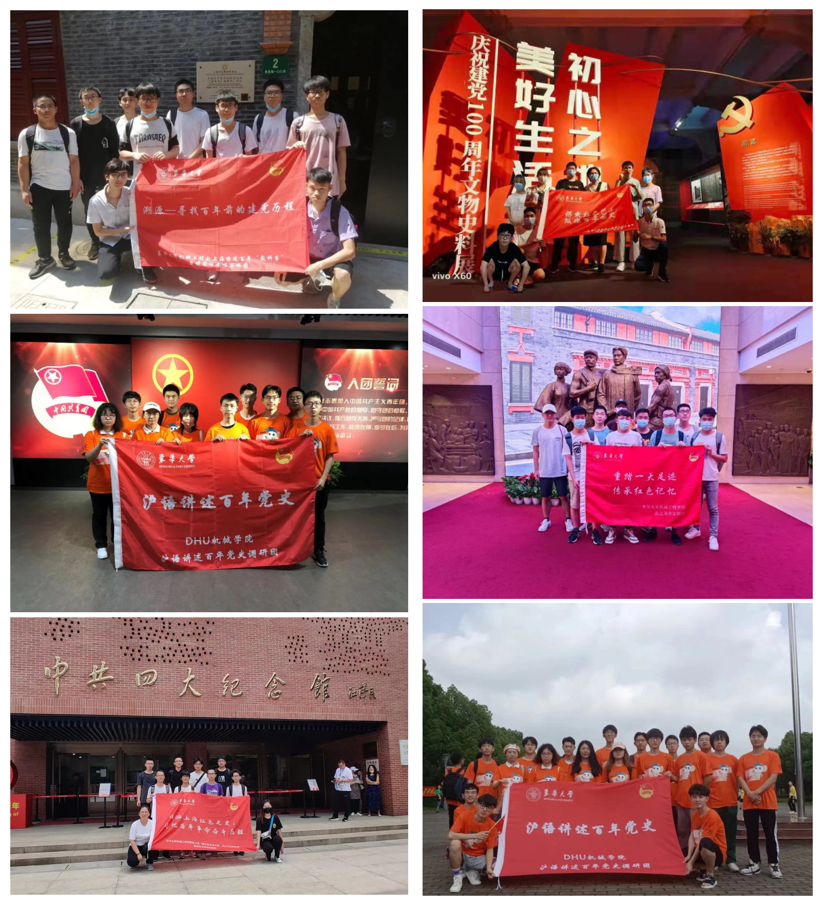 打造行走的课堂,让学习教育更灵活、更深入。组织12支党史学习教育实践团,围绕“献礼百年奋斗路·初心不改再出发”主题,实地走访党的不同时期革命旧址,手绘红色地图、红色漫画、革命英烈纪念册、录制沪语党史学习视频,打造“设计+党史”、“VR+党史”、“沪语+党史”学习新模式。