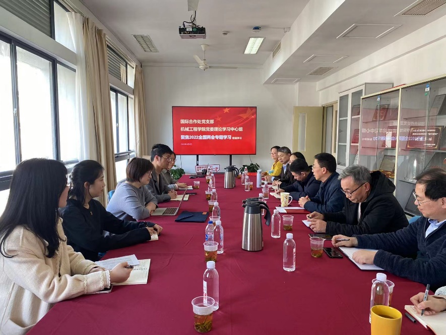 3月9日,学院党委理论学习中心组与国际合作处党支部开展联组学习,聚焦2022年全国两会进行了专题学习。由学院党委书记王新厚领学,国际合作处处长赵明炜、副处长杨升元等同志与学院党委理论学习中心组全体成员参与学习。