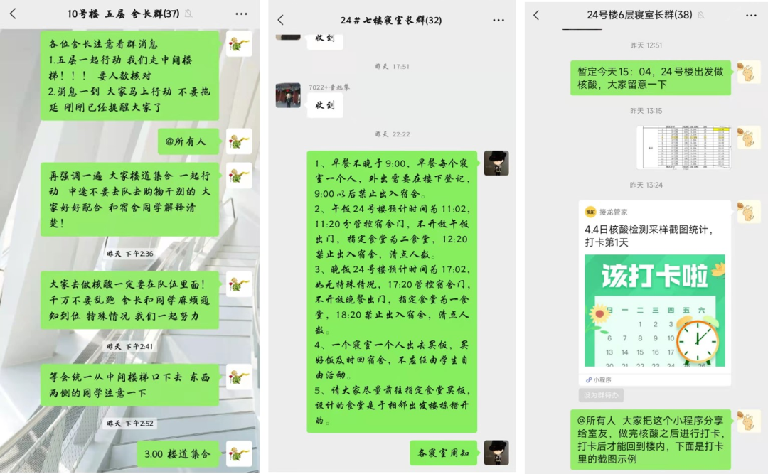 支部全员报名*番号鸽 学生党员志愿者储备队,以实际行动践行一名共产党员应有的政治品格与政治素养。在全校组织的核酸检测中,支部党员袁权静梓、武晓蒸、马采青等主动多次认领志愿服务,累计服务50余小时,协助做好人员登记、扫码检测、维持秩序等工作;在网格化管理中,支部党员齐文利、金宇健、武晓蒸等自觉担任楼层长,不舍昼夜、严谨细致地落实学校疫情防控工作部署,确保每一位学生实现错时错峰有序参加核酸检测,按时保质收集每一份核酸检测截图、抗原检测结果。