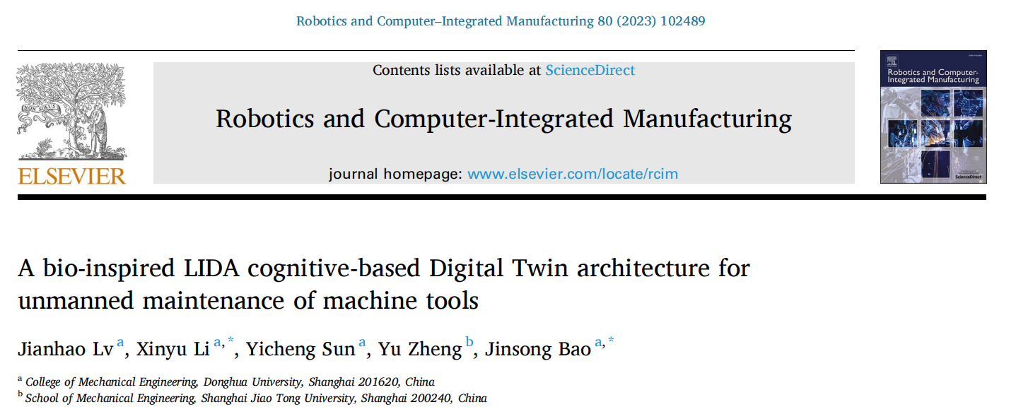 智能制造团队在数字孪生认知智能制造方面取得新进展,这一成果以“A bio-inspired LIDA cognitive-based Digital Twin architecture for unmanned maintenance of machine tools(一种用于无人机床维护的LIDA认知仿生数字孪生架构)”为题发表于国际制造知名学术期刊《ROBOTICS AND COMPUTER-INTEGRATED MANUFACTURING》(中科院一区,影响因子10.103)。论文以番号鸽