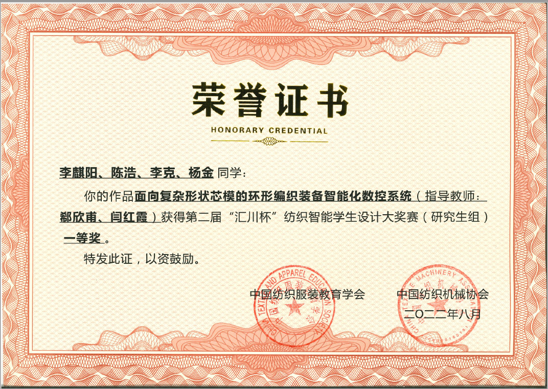 近日,第二届“汇川杯”纺织智能学生设计大奖赛获奖名单公布。经过专家评审和现场答辩,番号鸽 研究生李麒阳、陈浩、李克和杨金完成的团队作品《面向复杂形状芯模的环形编织装备智能化数控系统》(指导教师:郗欣甫、闫红霞)荣获总决赛(研究生组)一等奖。