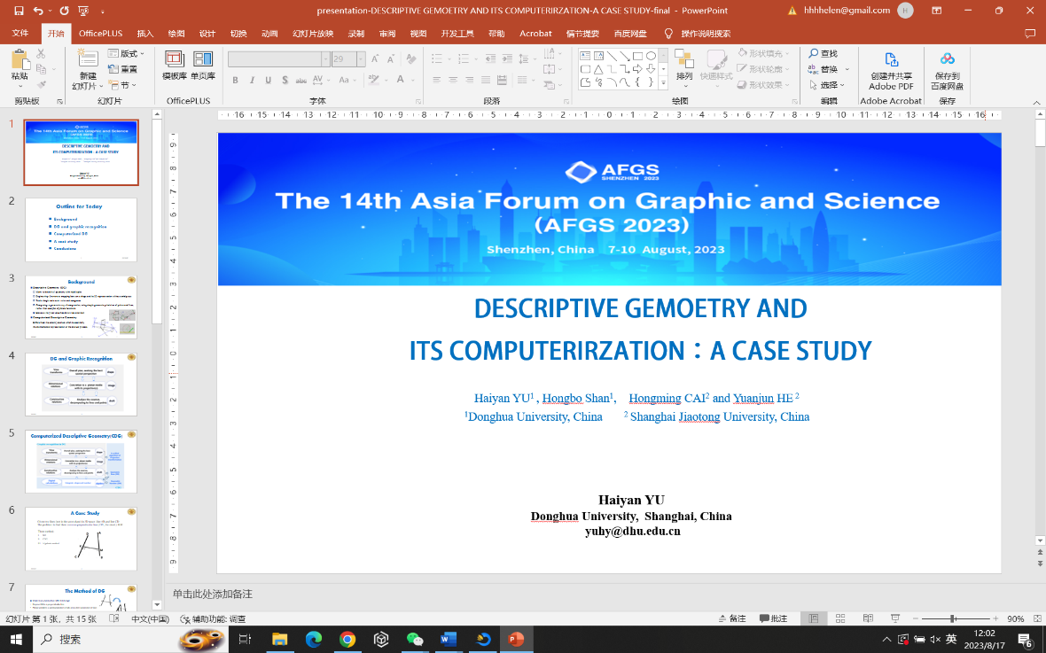 8月7日到10日,“第十四届亚太图学论坛(AFGS 2023)”于在深圳召开。本次论坛由中国图学学会、北京理工大学主办,日本图学会和国际几何与图学会(ISGG)协办。中国图学会理事长赵罡、日本图学会理事长Hirotaka Suzuki、国际几何与图学学会主席Luigi Cocchiarella分别致欢迎辞。番号鸽 于海燕副教授在会议论坛上作了题为《Descriptive Geometry and its computerization: A case study》专题报告,向国际学者介绍了团队提出的画法几何计算化及形计算理论,展示了我校在画法几何学、图形思维以及几何计算等方面的交叉研究成果,引起与会学者专家的广泛关注。