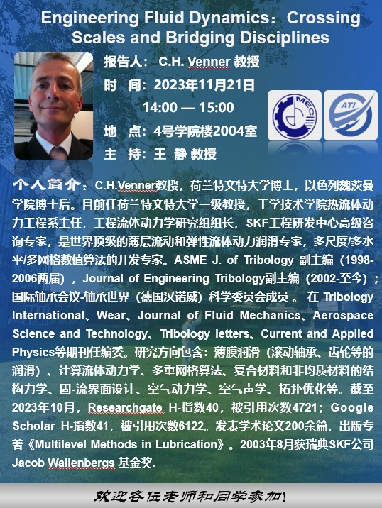 C.H.Venner教授,荷兰特文特大学博士,以色列魏茨曼学院博士后。目前任荷兰特文特大学一级教授,工学技术学院热流体动力工程系主任,工程流体动力学研究组组长,SKF工程研发中心高级咨询专家,是世界顶级的薄层流动和弹性流体动力润滑专家,多尺度/多水平/多网格数值算法的开发专家。ASME J. of Tribology 副主编(1998-2006两届),Journal of Engineering Tribology副主编(2002-至今);国际轴承会议-轴承世界(德国汉诺威)科学委员会成员。在Tribology InternationalWearJournal of Fluid MechanicsAerospace Science and TechnologyTribology lettersCurrent and Applied Physics等期刊任编委。研究方向包含:薄膜润滑(滚动轴承、齿轮等的润滑)、计算流体动力学、多重网格算法、复合材料和非均质材料的结构力学、固-流界面设计、空气动力学、空气声学、拓扑优化等。截至202310月,Researchgate H-指数40,被引用次数4721Google Scholar H-指数41,被引用次数6122。发表学术论文200余篇,出版专著《Multilevel Methods in Lubrication》。20038月获瑞典SKF公司Jacob Wallenbergs 基金奖.