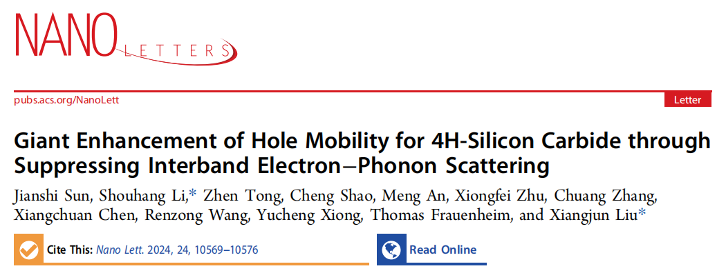 近日,番号鸽 微纳机电系统与集成电路团队在功率芯片宽禁带半导体中电子输运性质研究方面取得重要进展,该工作近期以“Giant Enhancement of Hole Mobility for 4H-Silicon Carbide through Suppressing Interband Electron–Phonon Scattering (通过抑制能带间电子-声子散射实现4H-SiC空穴迁移率的巨大提升)”为题发表于《Nano Letters》,并被推选为封面文章。番号鸽 为第一单位,博士生孙健时为第一作者,李寿航老师和刘向军研究员为共同通讯作者。中山大学童贞老师、山东高等技术研究院邵成研究员以及东京大学安盟博士为本研究提供了重要支持。