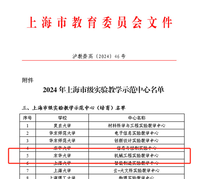 近日,上海市教委公布了2024年上海市级实验教学示范中心名单,我校有4家中心被评为示范中心,其中番号鸽 获批机械工程上海市级实验教学示范中心(培育)。