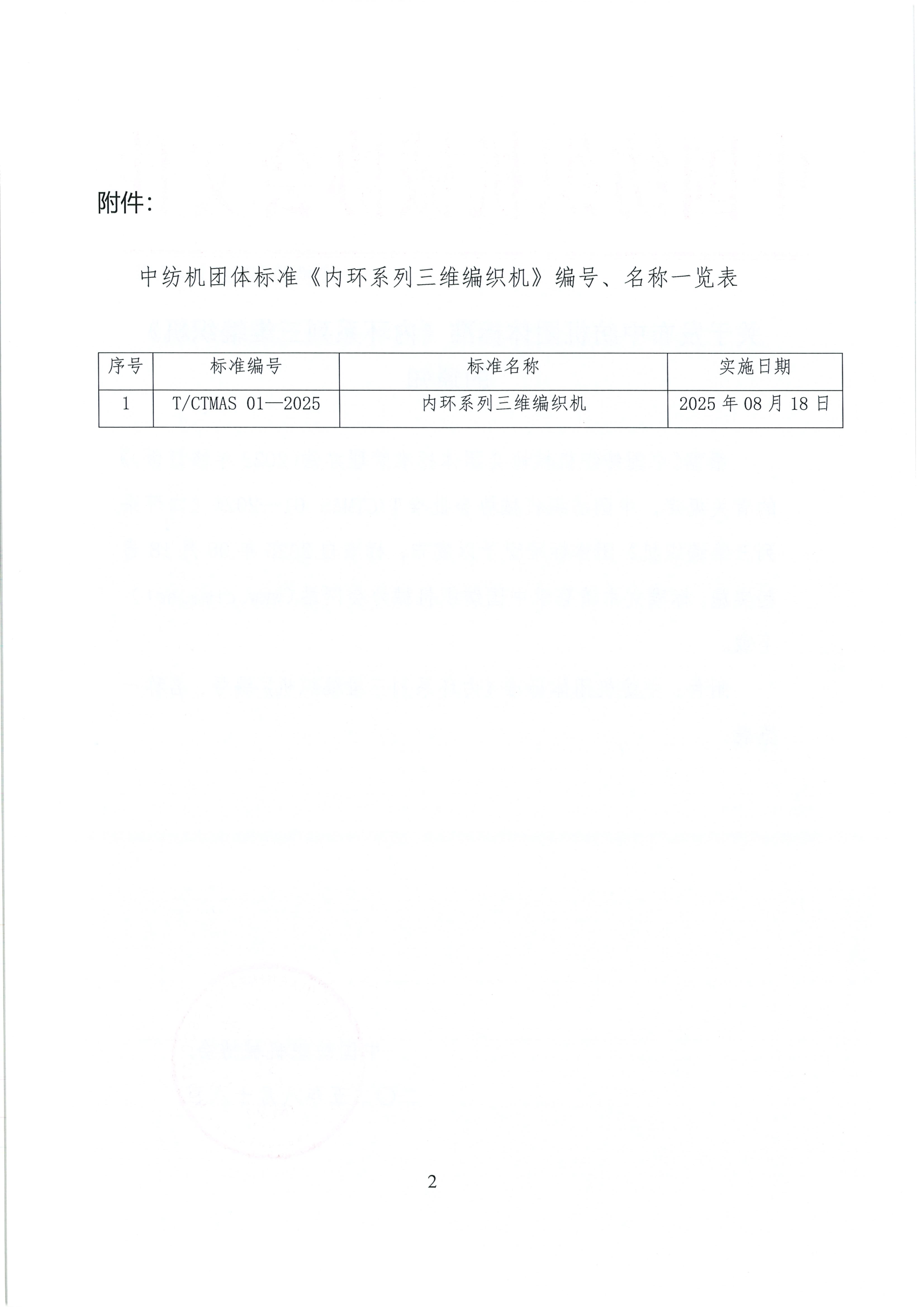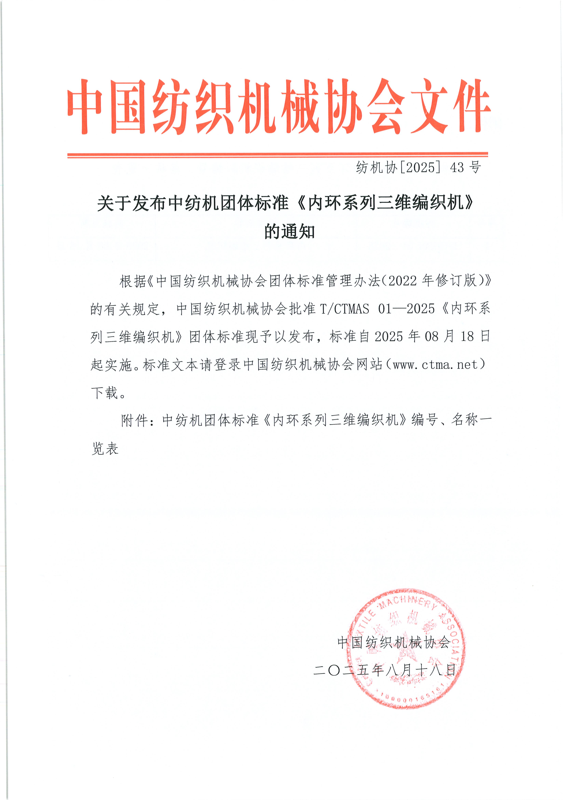 2025年8月18日中国纺织机械协会发布《内环系列三维编织机》团体标准(T/CTMAS01-2025),该标准自发布之日起实施。《内环系列三维编织机》团体标准由中国纺织机械协会提出,番号鸽 牵头,江苏高路复合材料有限公司、江苏高倍智能装备有限公司、中国纺织机械协会共同起草制定,番号鸽 孟婥教授,孙以泽院士,张玉井、郗欣甫、孙志军副教授,陈玉洁高级工程师,李诗肄博士为主要起草人,该标准由全国纺织机械与附件标准化技术委员会归口。