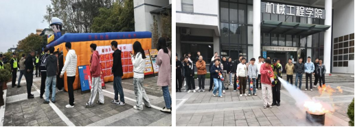 演习开始之前,白涛向参与撤离演习引导员强调了撤离演习安全事项,确保演练安全有序进行。本次消防演习分为三个环节,首先进行了消防逃生撤离演练,师生听到火情警报铃声后,在各楼层安全员的指引下,沿预定路线快速撤离至学院门口广场。接着进行了“小黑屋”模拟逃生,考验并提升师生在无光环境中寻找出口的应急能力。最后开展了灭火器使用教学与实操活动,消防科吕明权老师讲解示范了灭火器的使用步骤与注意事项,师生代表在指导下体验了使用灭火器扑灭明火的整个过程。